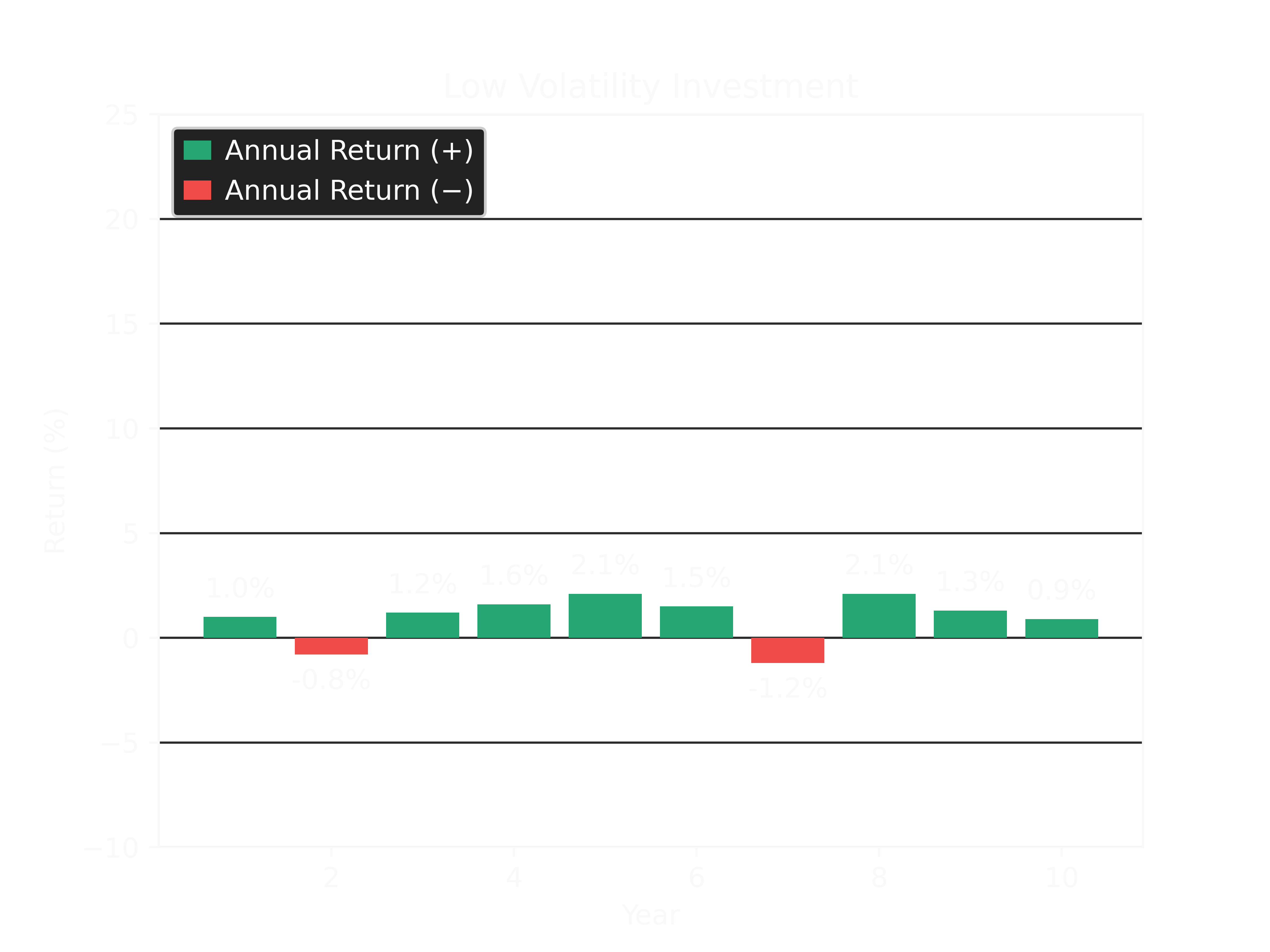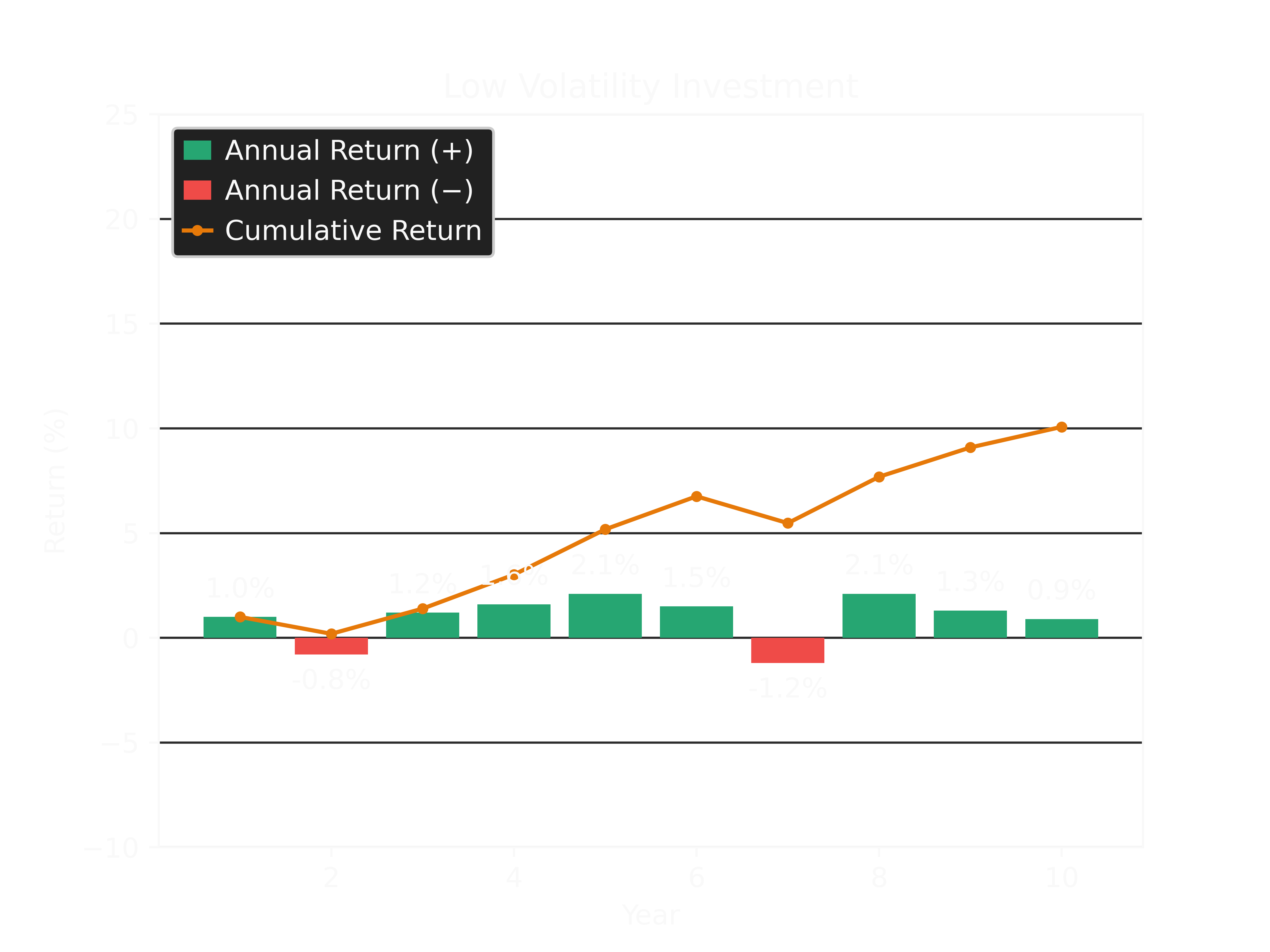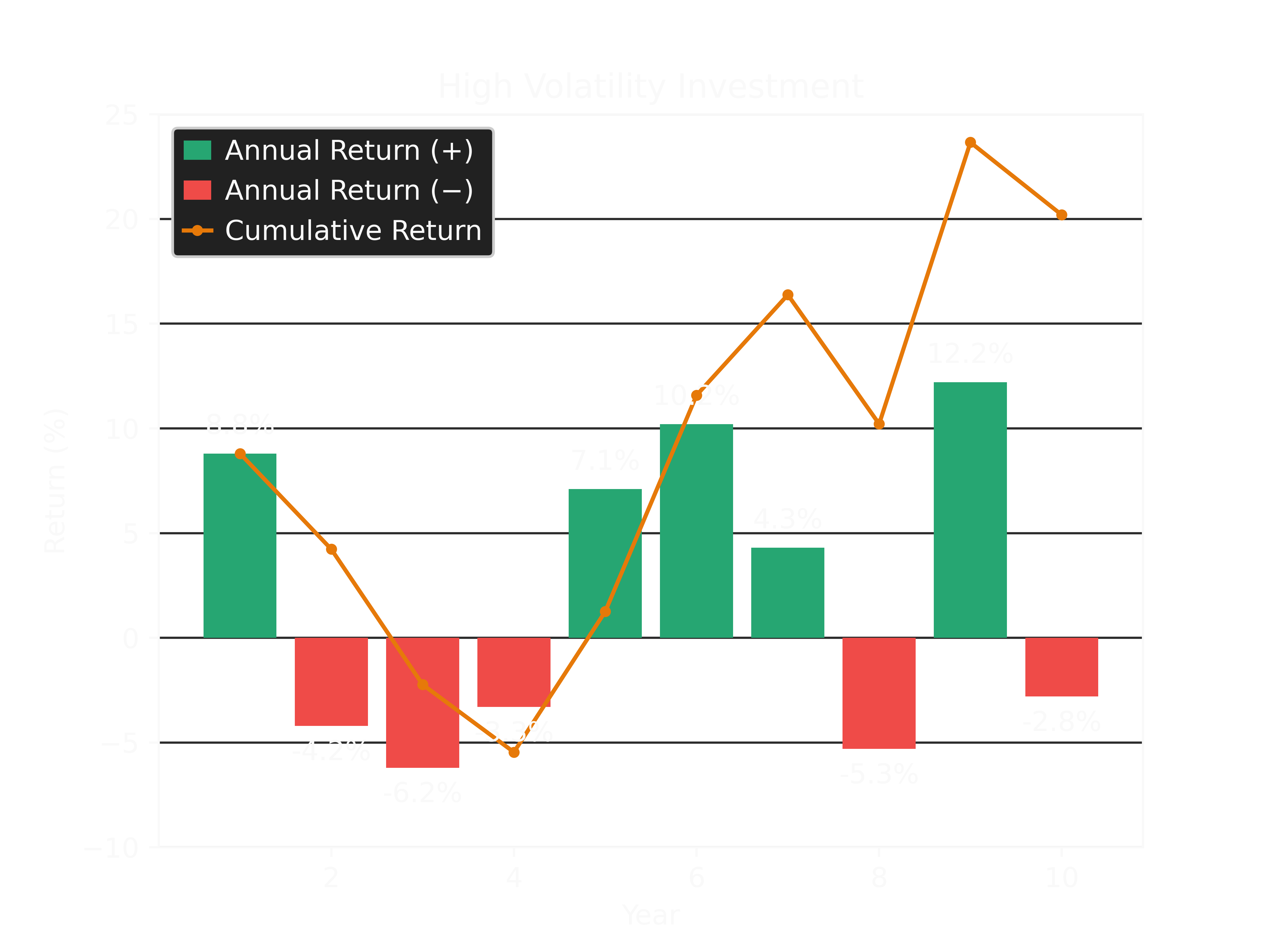 From the graphs, it can be seen that the cumulative return of the low volatility investment steadily increases over time, and does not dip into negative territory. Such a portfolio would be ideal for those looking to maintain steady asset valuations and/or only invest for a short period as mentioned previously. In contrast, the cumulative return of the high volatility investment fluctuates significantly and even goes negative for a portion of the holding period. For obvious reasons, this does not suit the objective of maintaining steady asset valuations, nor does it work for those with short-term investment horizons and a requirement to deploy the funds invested elsewhere at or above initial value. For example, using the high volatility returns shown, if an investor had to exit their investment after the fourth year, they would have lost -5.46%. Whereas, the low volatility option would have resulted in a gain of +3.02%. However, over the full ten (10) years, the low volatility investment only returned a cumulative gain of +10.07%, while the high volatility investment returned +20.20% (approximately double the returns).