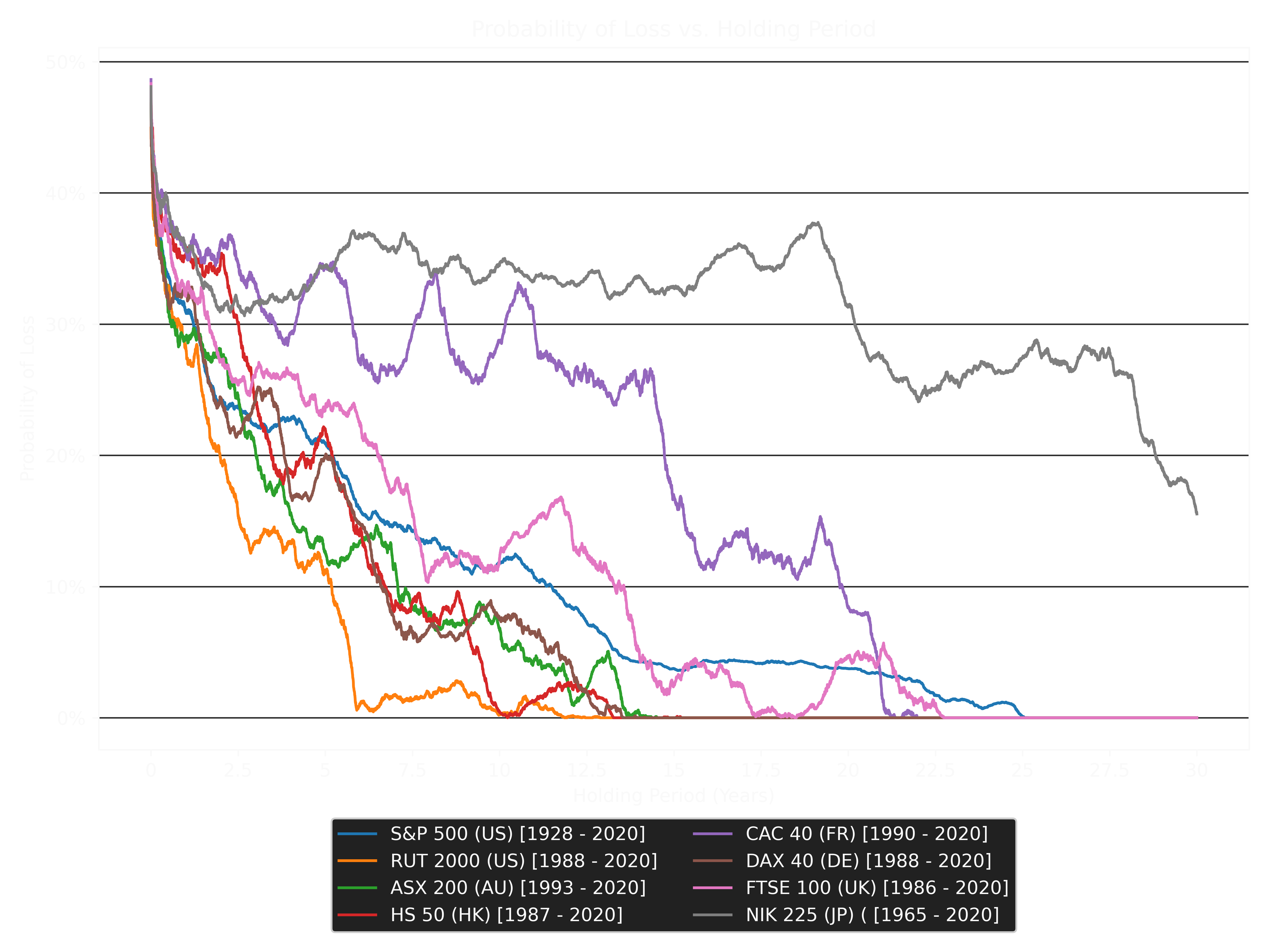 To better showcase this phenomenon, the pricing data of various stock indices were used to calculate the probability of loss over different holding periods ranging from one (1) day to thirty (30) years: where each holding period acted as window that was then passed over the available data. One can see that the affect of stock market volatility over longer holding periods is less pronounced than the shorter counterparts.