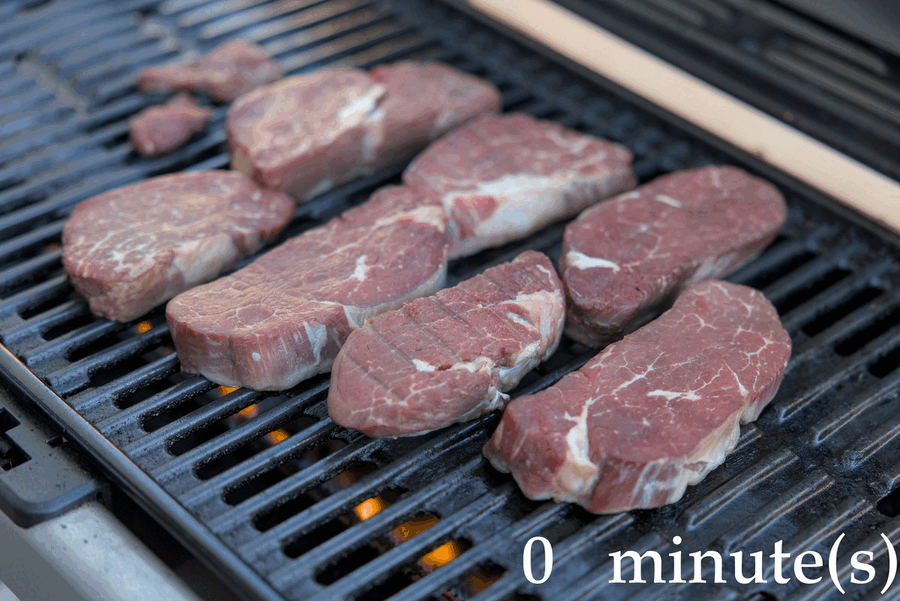 See the GIF animation below that captures a time-lapse of the cooking process over approximately 11 minutes. Note the turning over of the steaks after approximately 5-6 minutes, followed by their repositioning on the grill to ensure even heat exposure.