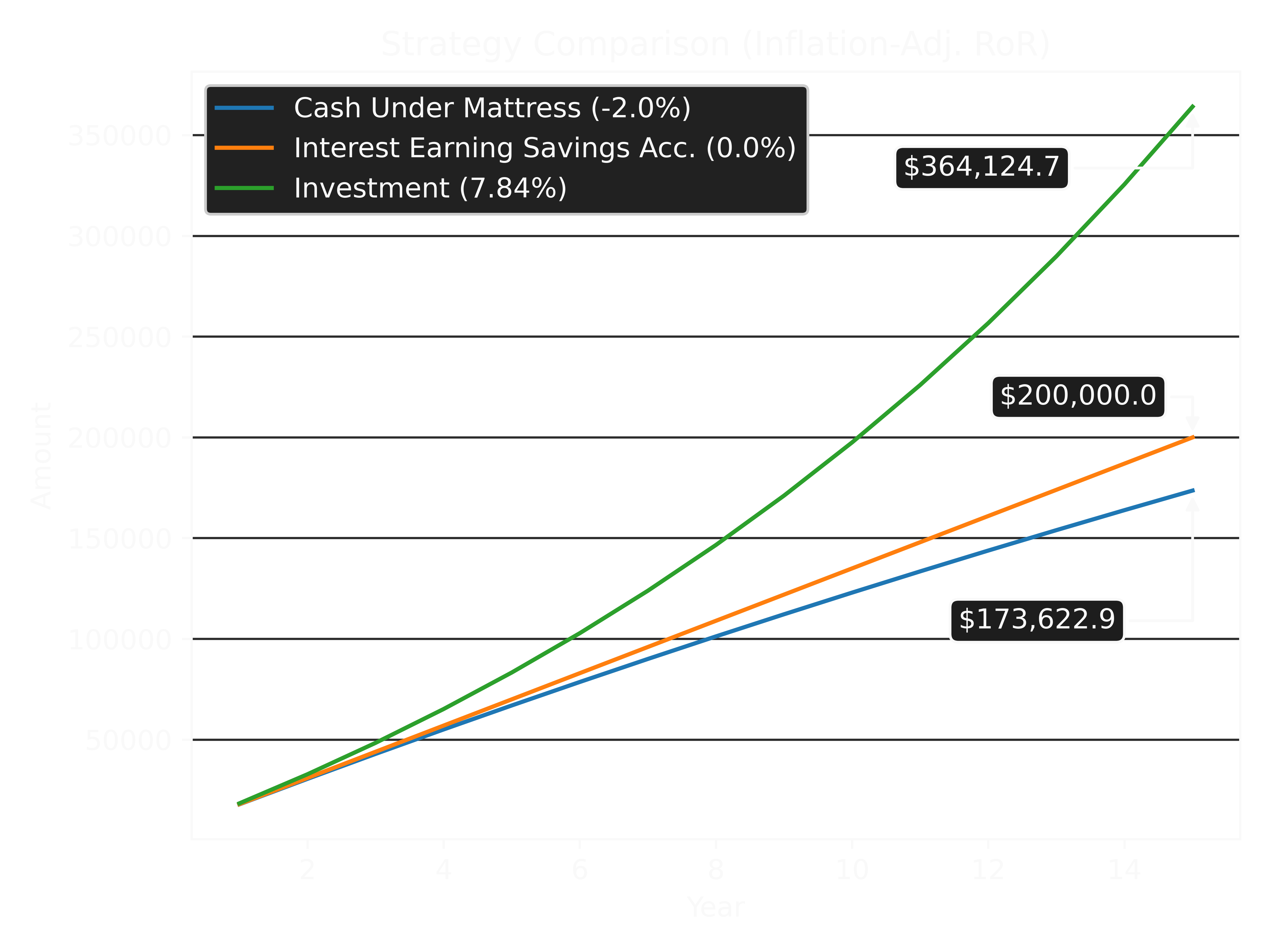 In other words, if one had selected the investing pathway, they would have over twice (2.1x) the money at the end of the 15 year period, compared to simply stockpiling cash under a mattress. Not only have they protected their original purchasing power (wealth), but they have increased it by more than double.