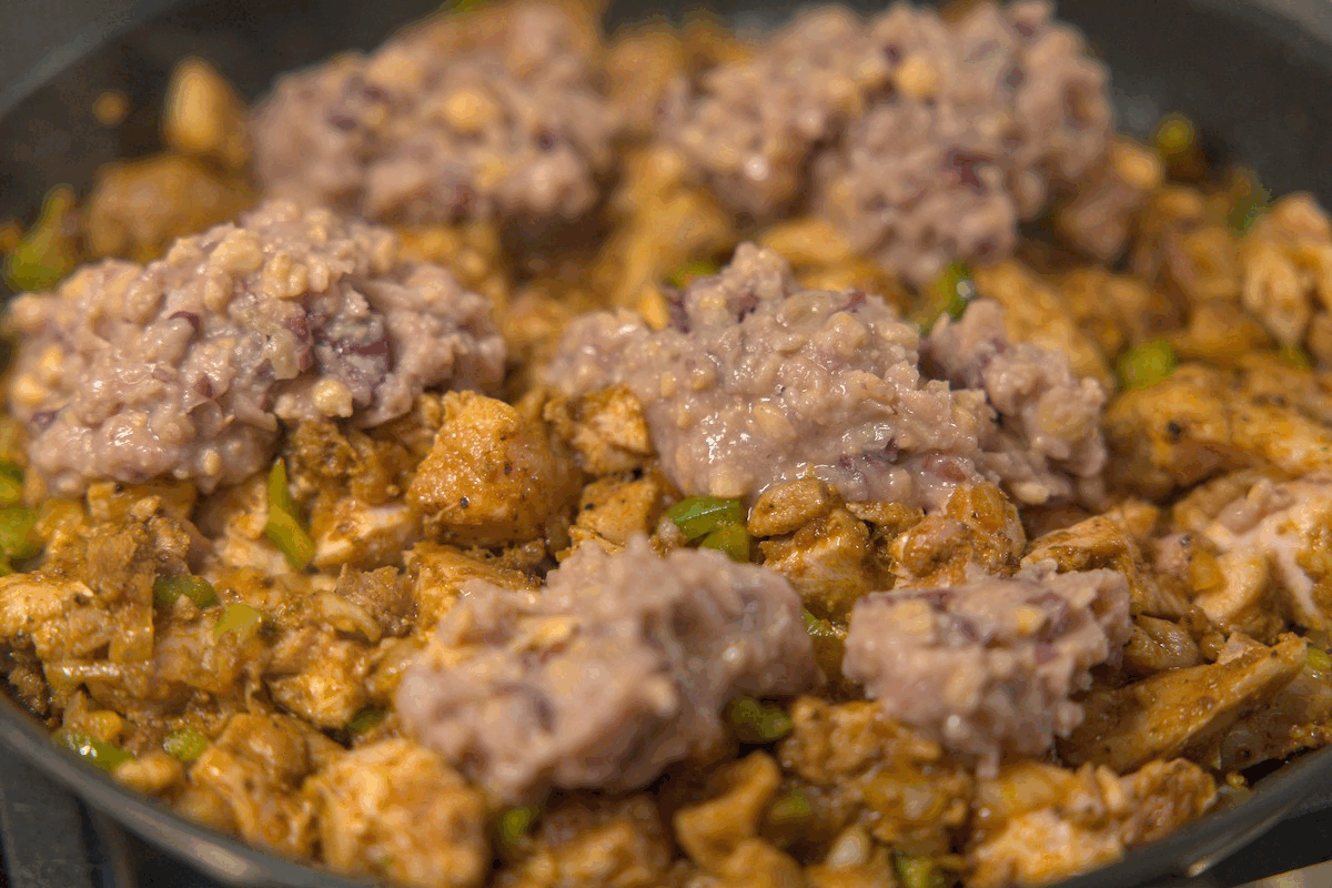Add seared chicken, sautéed onion, garlic, capsicum, and mashed beans to