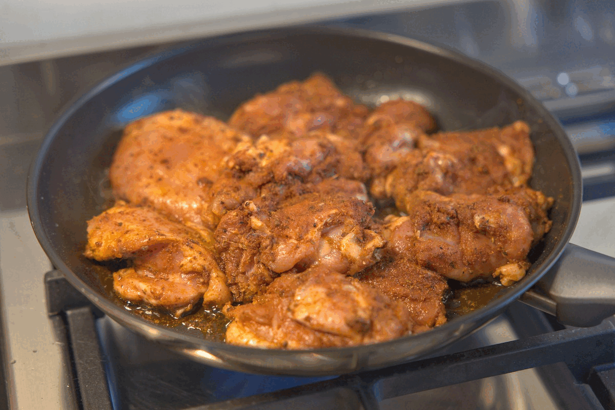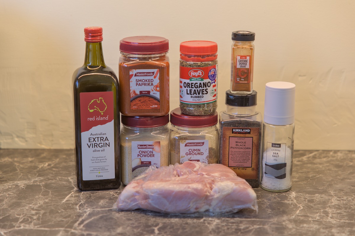 Add chicken to bowl; coat chicken with olive oil; then add spices and mix