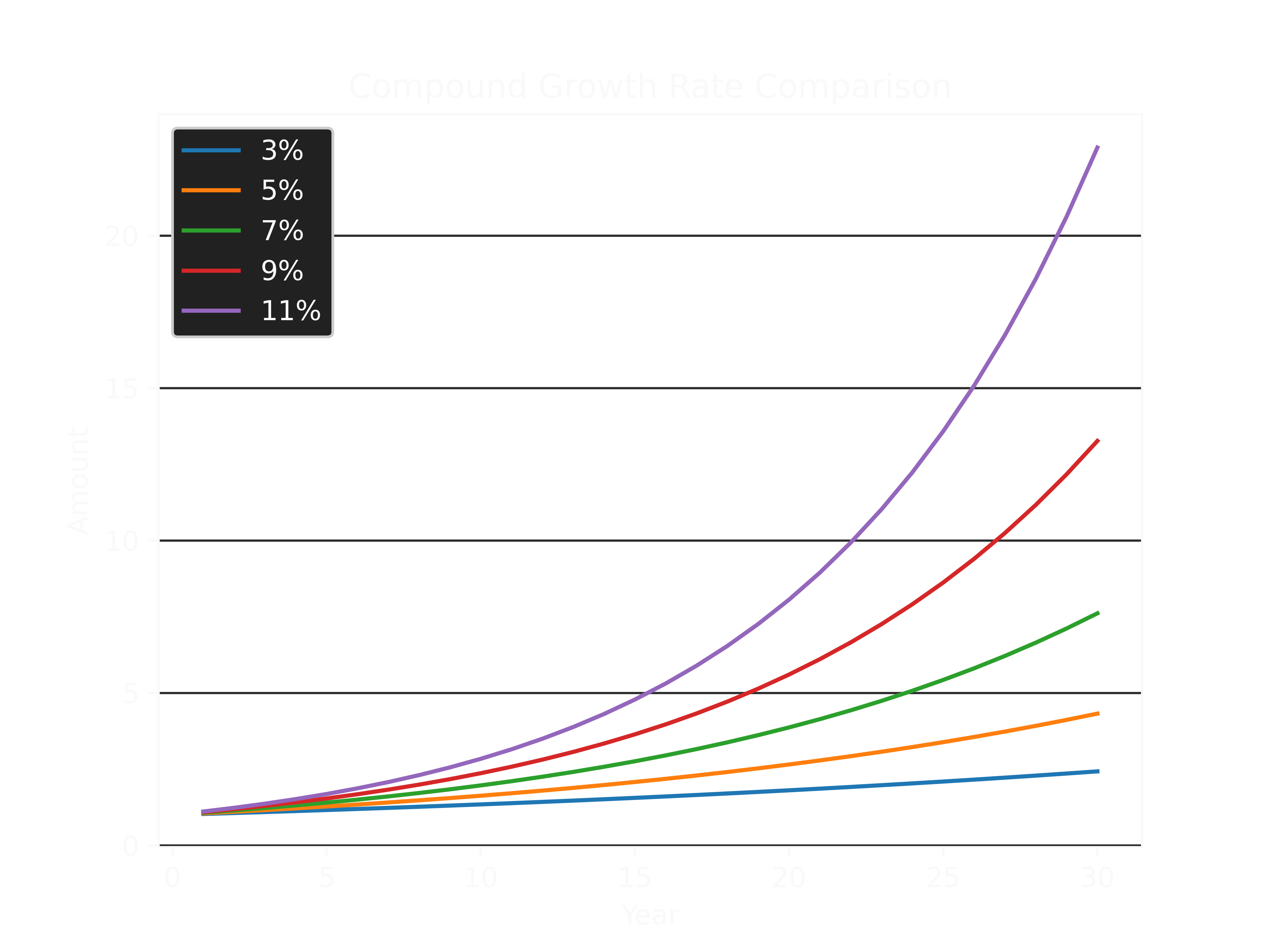 At first it may seem like the Rate of Return (RoR) is the only important parameter to prioritise when it comes to compound growth, however, the other critical variable is the investment duration. If an investment is not given sufficient time to let earnings/growth accumulate, then the full power of compounding is not utilised. This is best highlighted by plotting the growth of investments over thirty (30) years with varying rates of return.